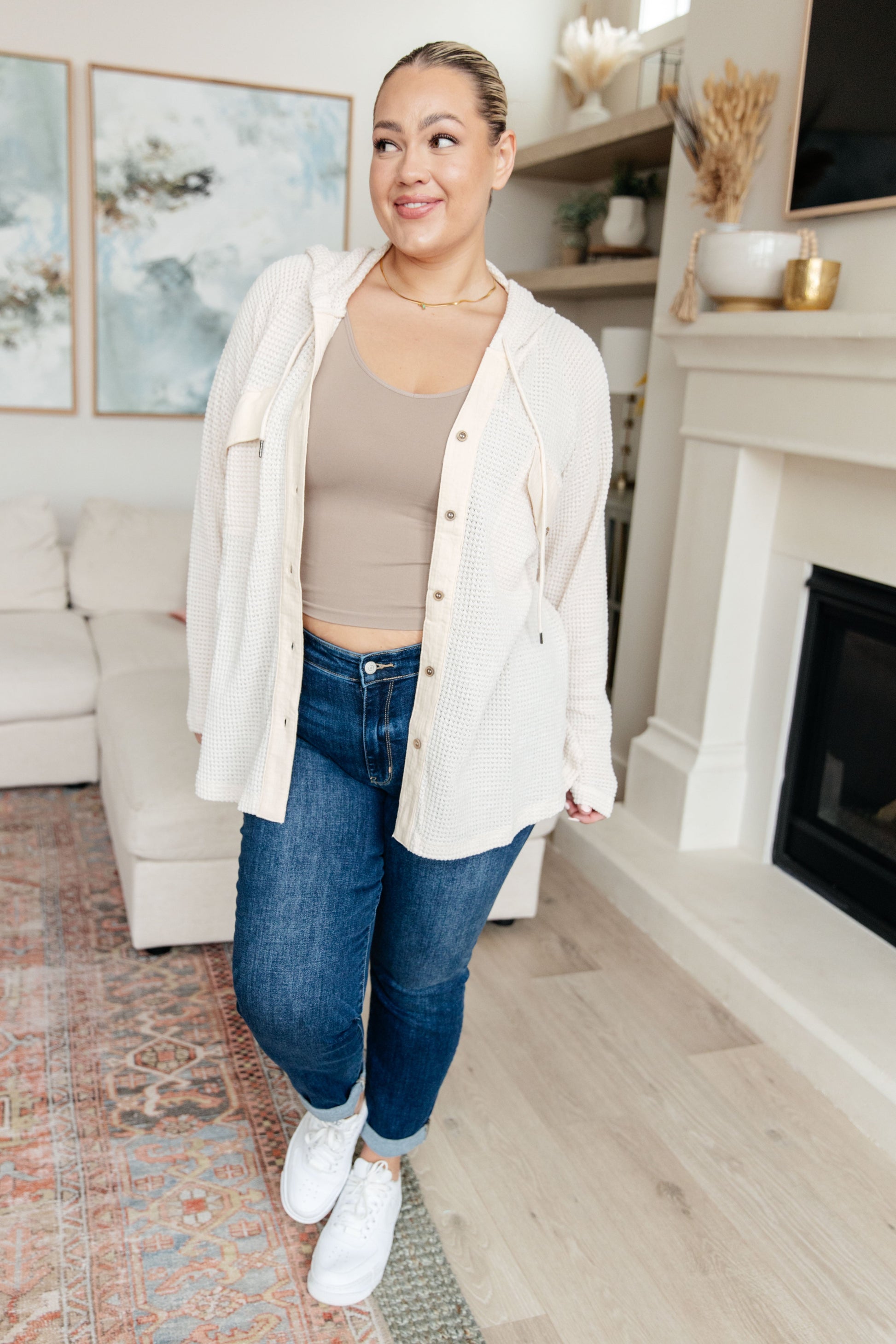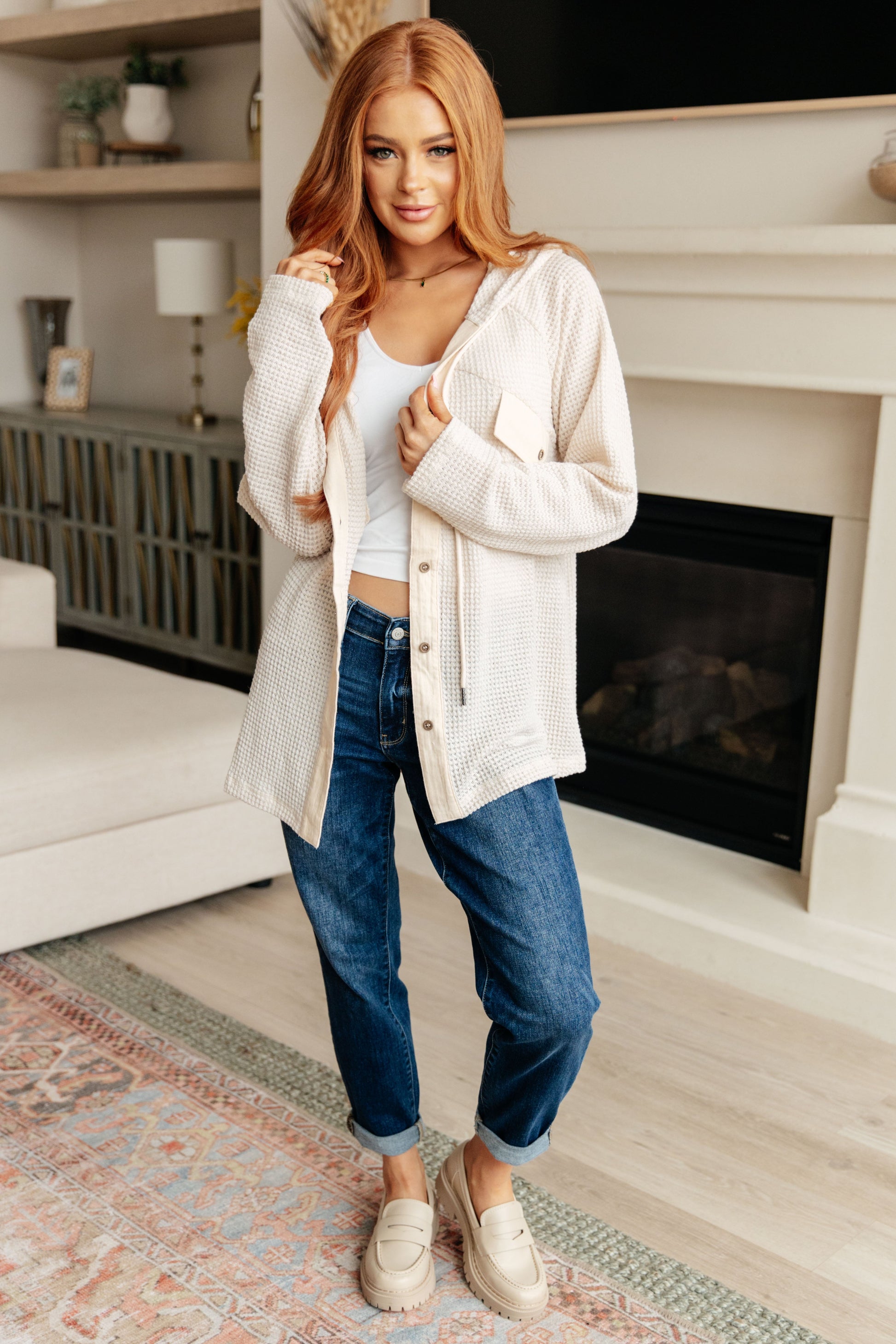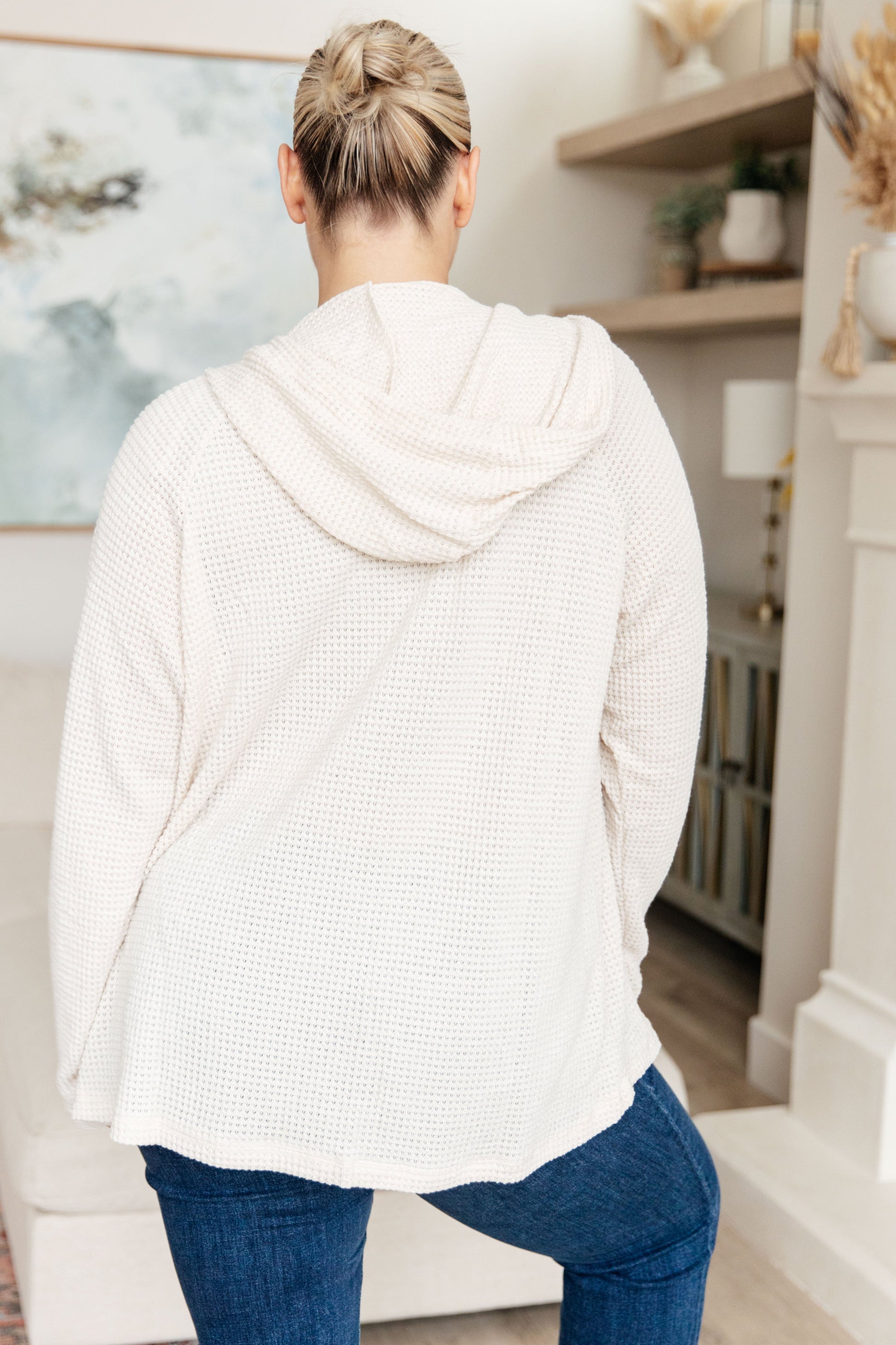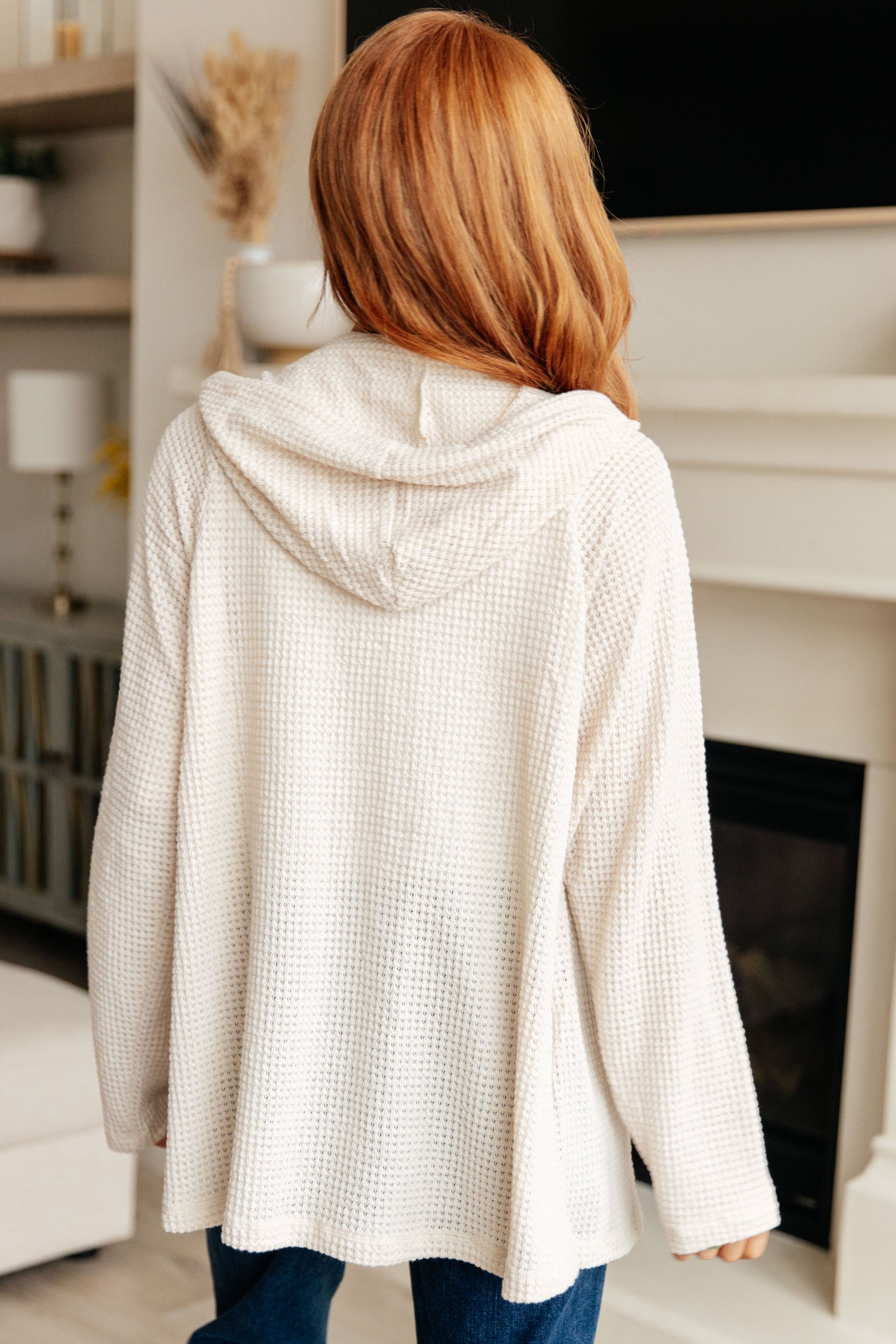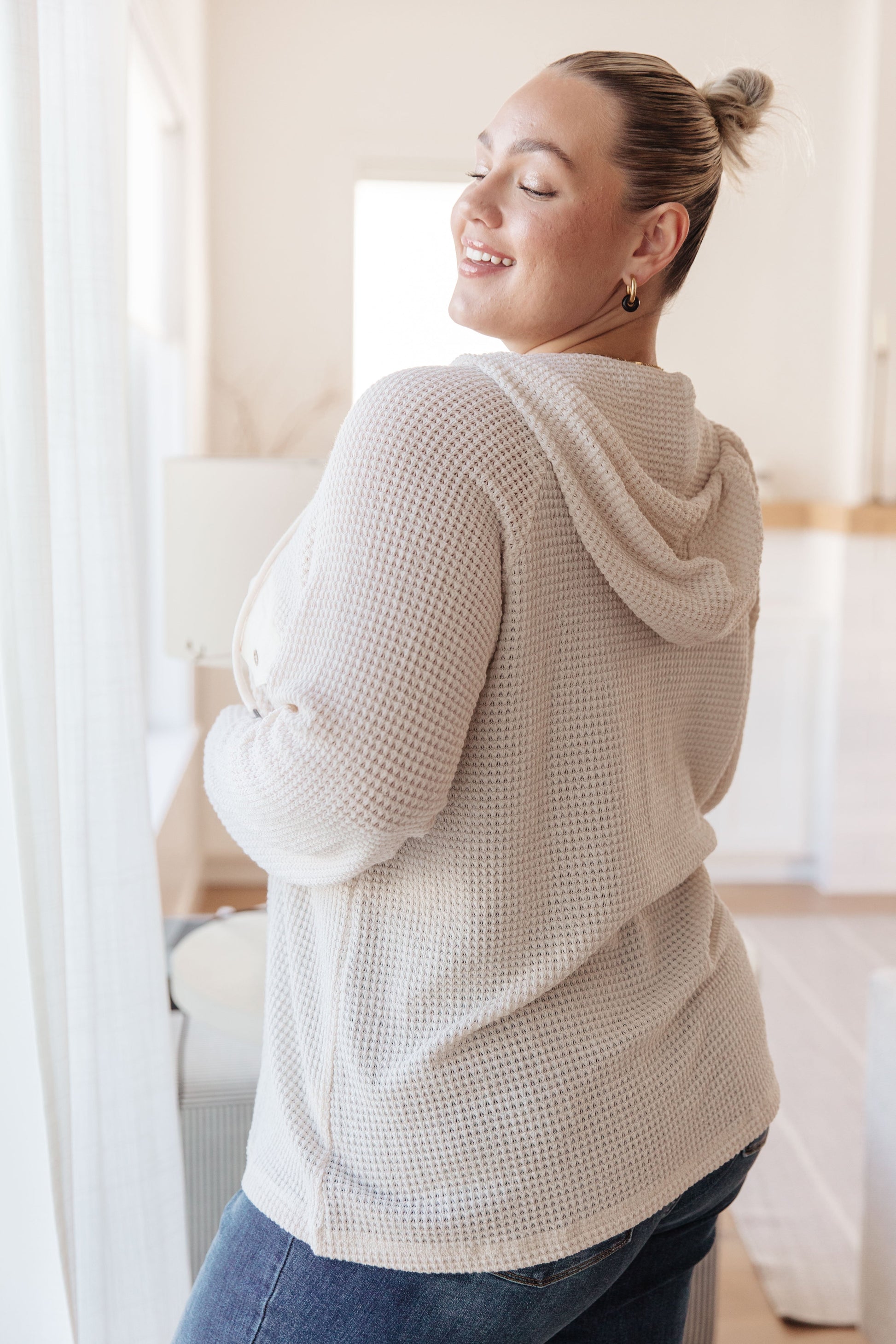 This Best Case Scenario Hooded Pullover is designed for easy comfort. Crafted with a waffle knit fabric adorned with a button front and generous hood, you can take on your day with warmth and style.
