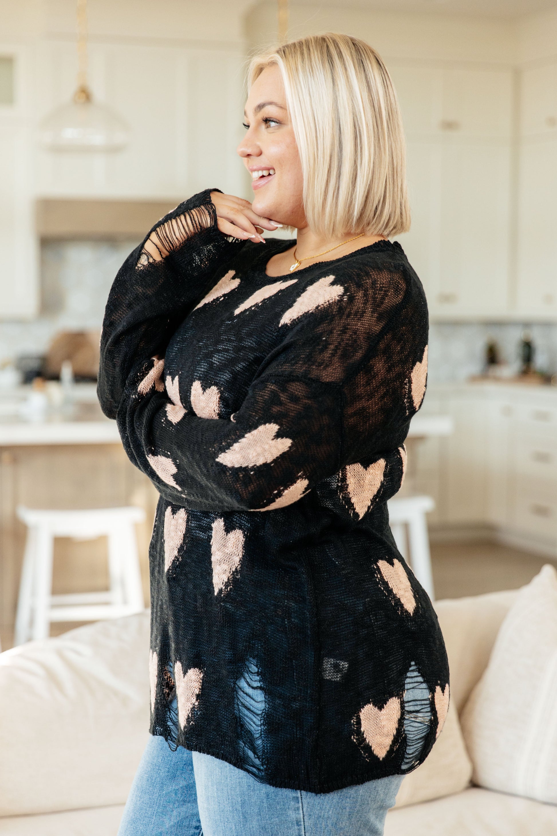 Express your tough love with this distressed sweater! Made from a unique slub sweater knit, this sweater features a stylish scoop neckline and a contrasting heart design. The distressed hem and sleeve add a touch of edginess to this playful and cozy sweater.
